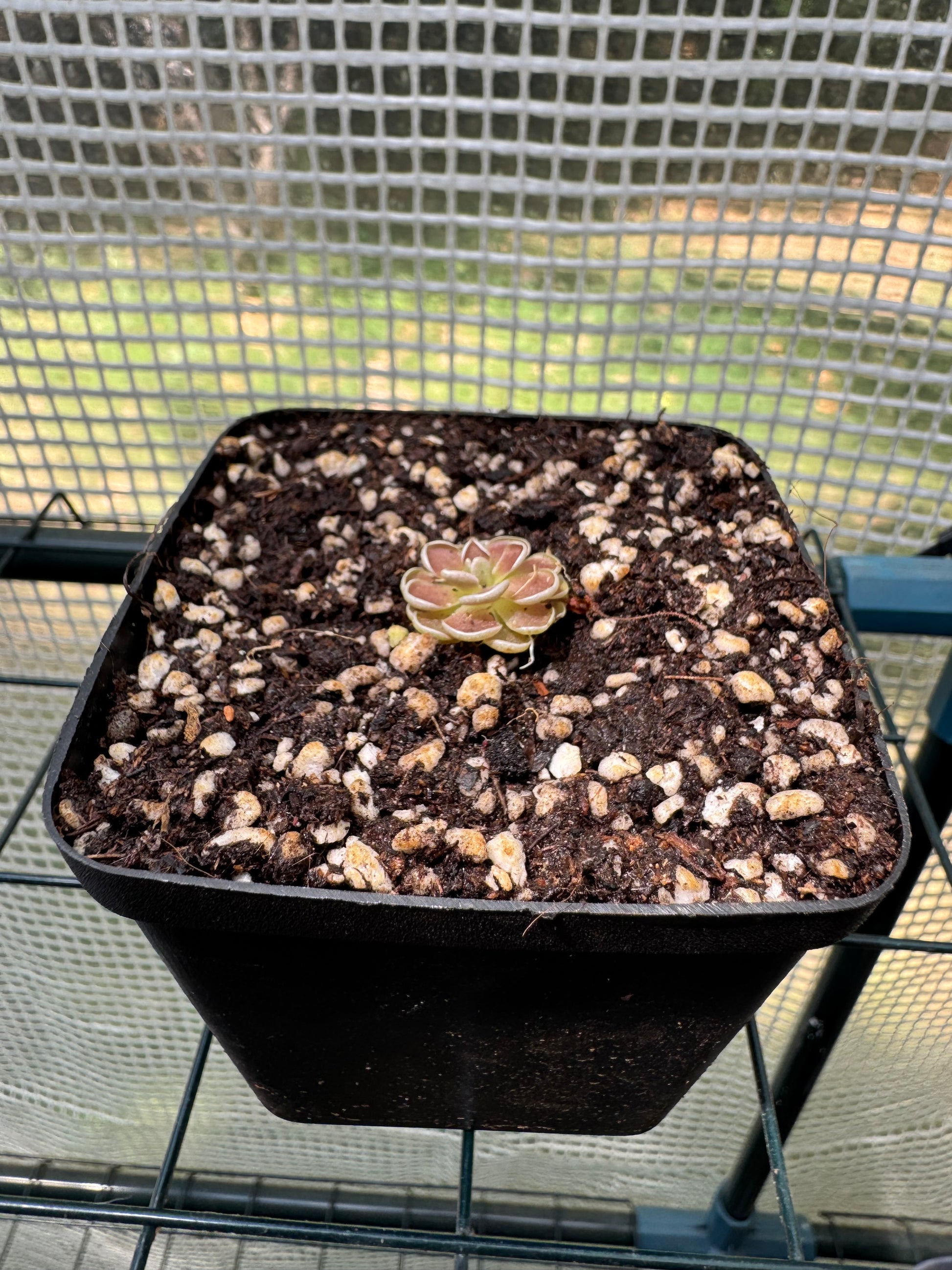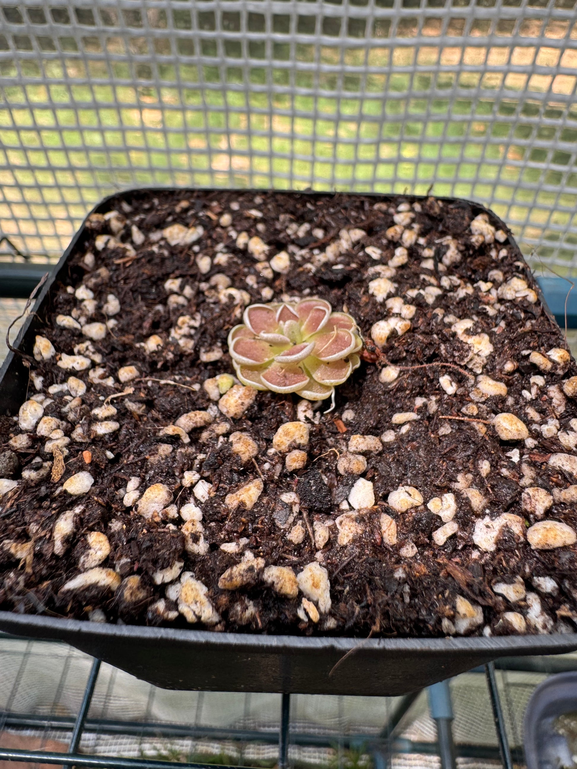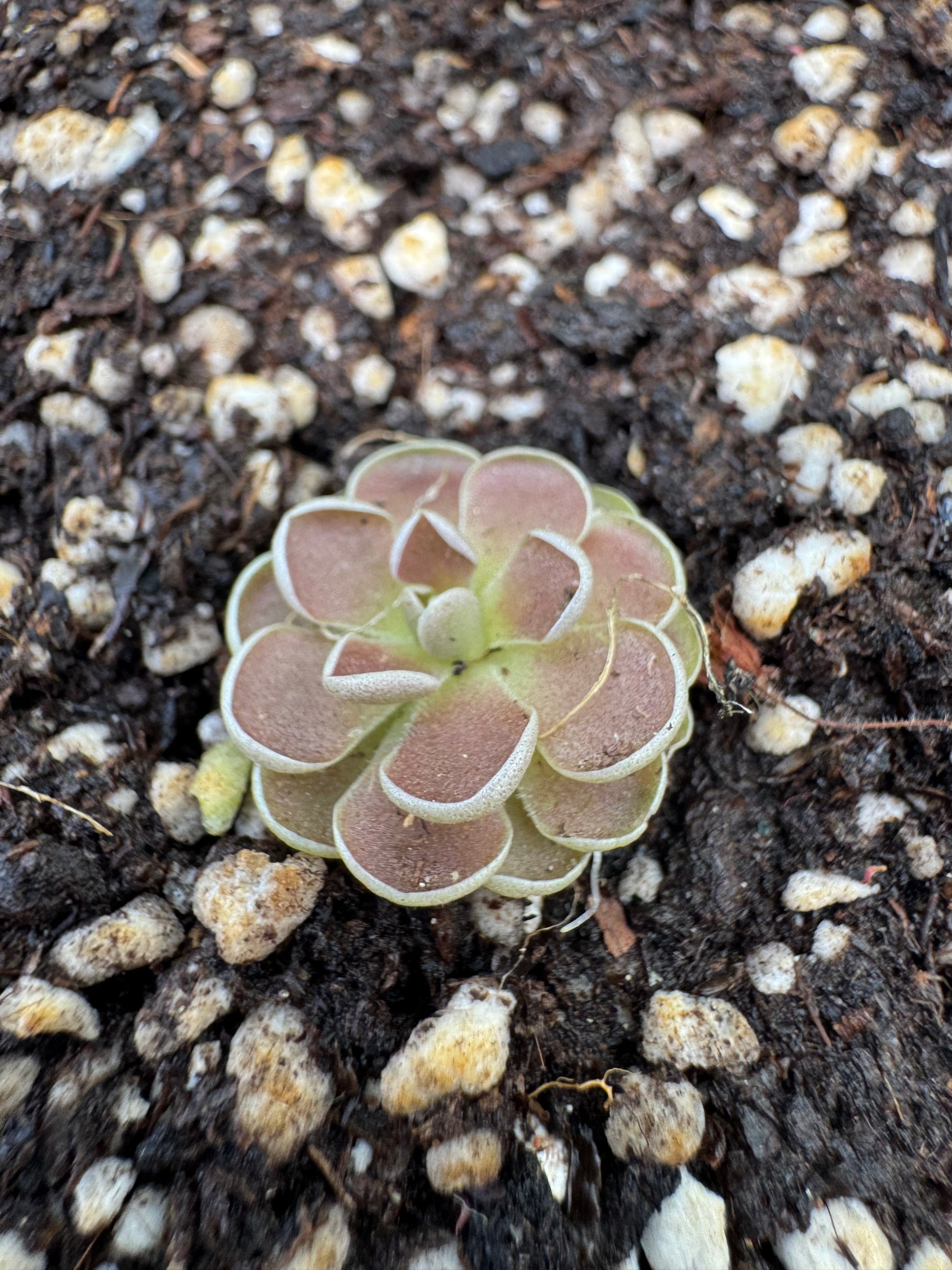 Pinguicula Ehlersiae is a charming Mexican butterwort known for its compact rosette and delicate, pastel-toned foliage. Its leaves form a tight, symmetrical spiral, often blushing with shades of pink under bright light, and are coated with tiny, sticky glands that trap unsuspecting insects. This species produces dainty, lavender-pink flowers on slender stalks, adding a touch of elegance to its already captivating appearance. Plant is shipped bare root with a pot and bag of soil as shipping these guy are quite tough as they don't have many roots to keep the plant in the pot.