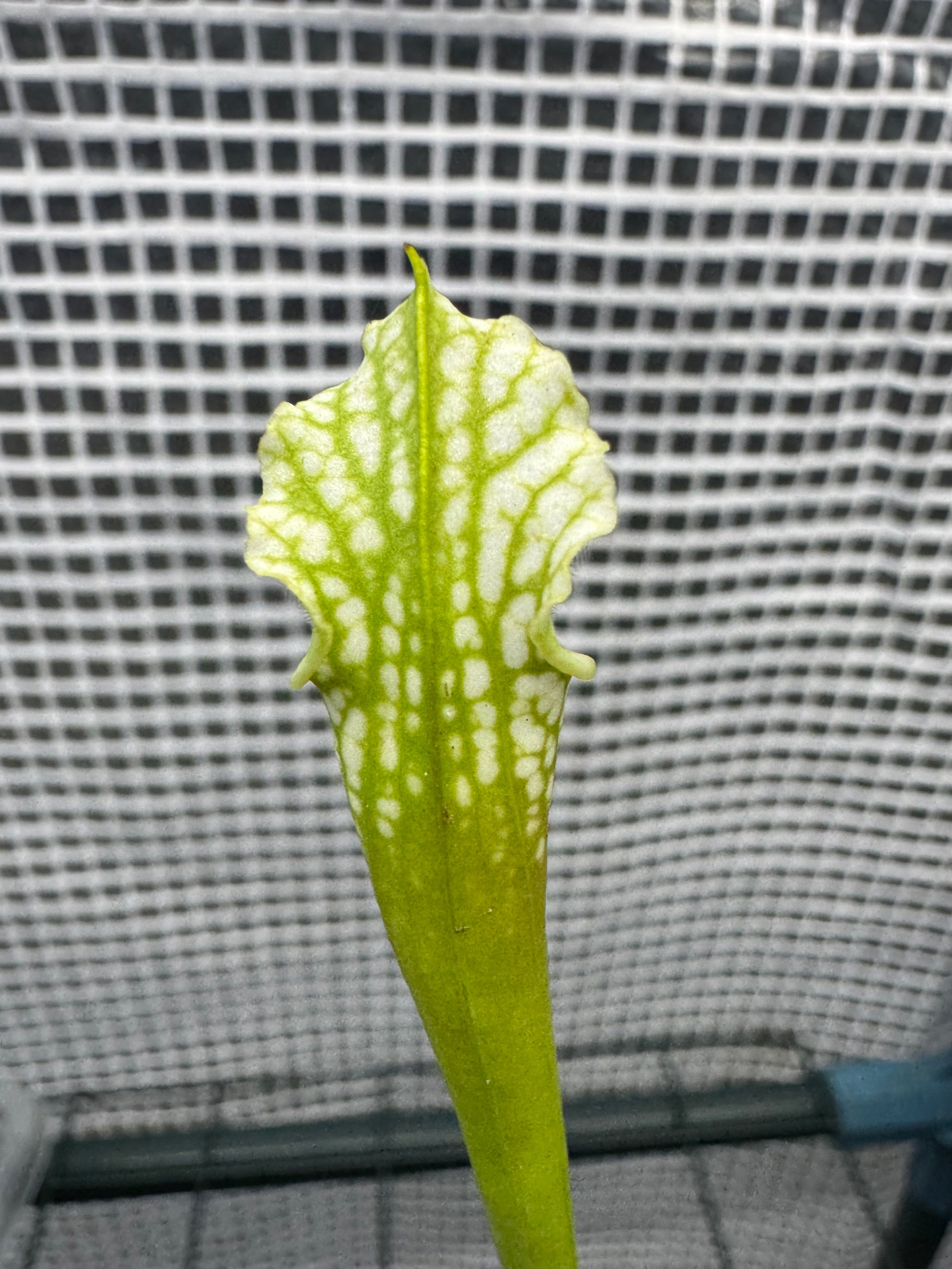 The Sarracenia “White Ghost” is a striking cultivar of the North American pitcher plant, admired for its elegant, pale pitchers that seem almost ghostly in appearance. Its tall, tubular traps are washed in creamy white with delicate green veining, creating a luminous contrast that stands out in any carnivorous plant collection. As with other Sarracenia, the pitchers lure and trap insects using nectar, bright coloration, and downward-facing hairs, making it both beautiful and functional. With its ethereal coloration and graceful form, the “White Ghost” is an exceptional choice for enthusiasts seeking a rare and visually captivating carnivorous plant.